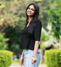 Designed for clean elegance, this black top features a structured bodice and soft puff sleeves for a subtle feminine silhouette.