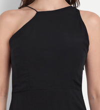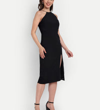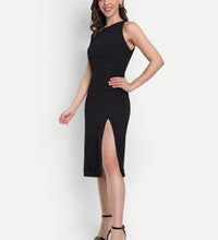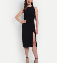 A sophisticated black dress with a sleek fit and a modern side slit—perfect for making a statement.