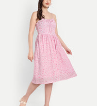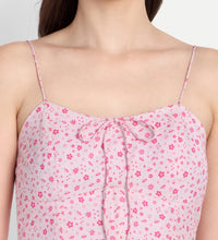 A sweet and playful midi dress featuring spaghetti straps, a front bow detail,