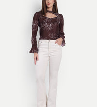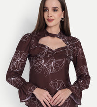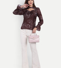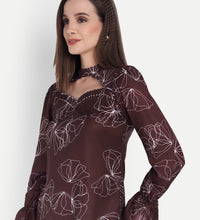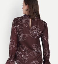 A graceful sweetheart neckline and high collar offer a striking contrast, while elastic gathers at the sleeve cuffs create a flowing, flared silhouette that moves beautifully.